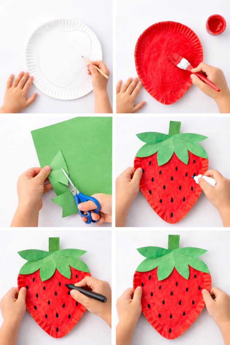 This craft turns a simple paper plate into a giant strawberry. The round shape of the plate already looks like the fruit, so kids only need to add color and a few details. The little black seeds and leafy top make it instantly recognizable.