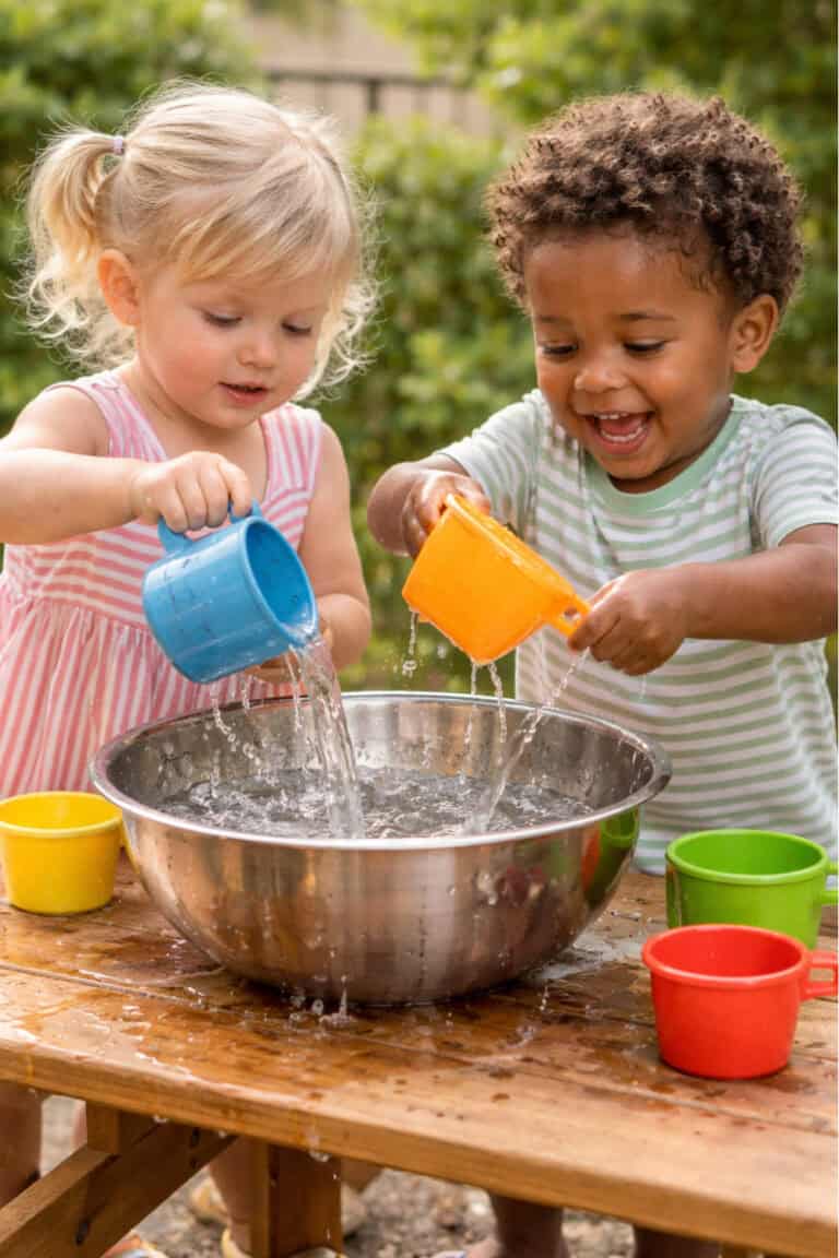 If you have a mixing bowl and a few measuring cups, you are ready. Fill the bowl with water and let them pour back and forth. Toddlers love the repetition and the little splashes.