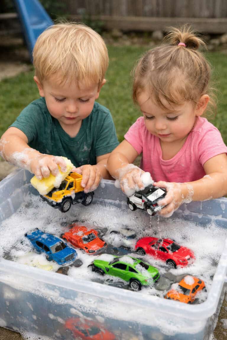 If you fill a bin with soapy water and add toy cars, you just created twenty minutes of focus. Scrubbing is oddly satisfying.