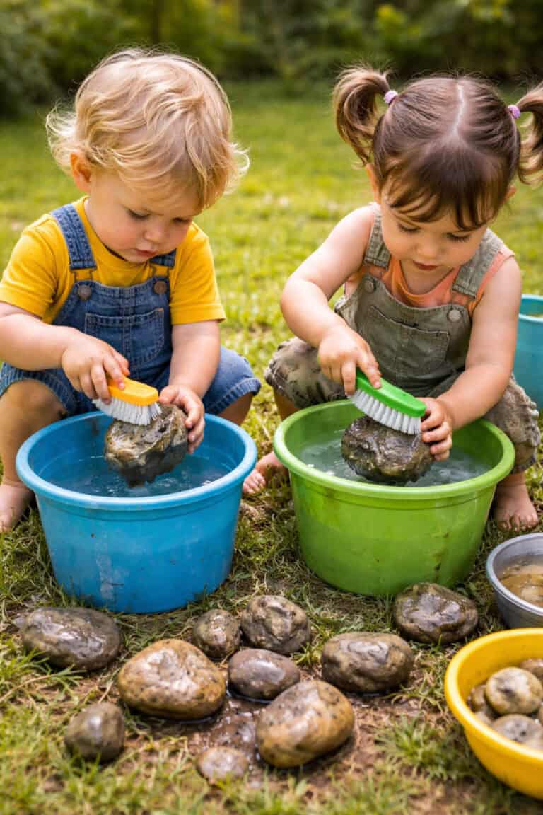 Toddlers love transforming dirty to clean. Place rocks in water and hand them a brush.