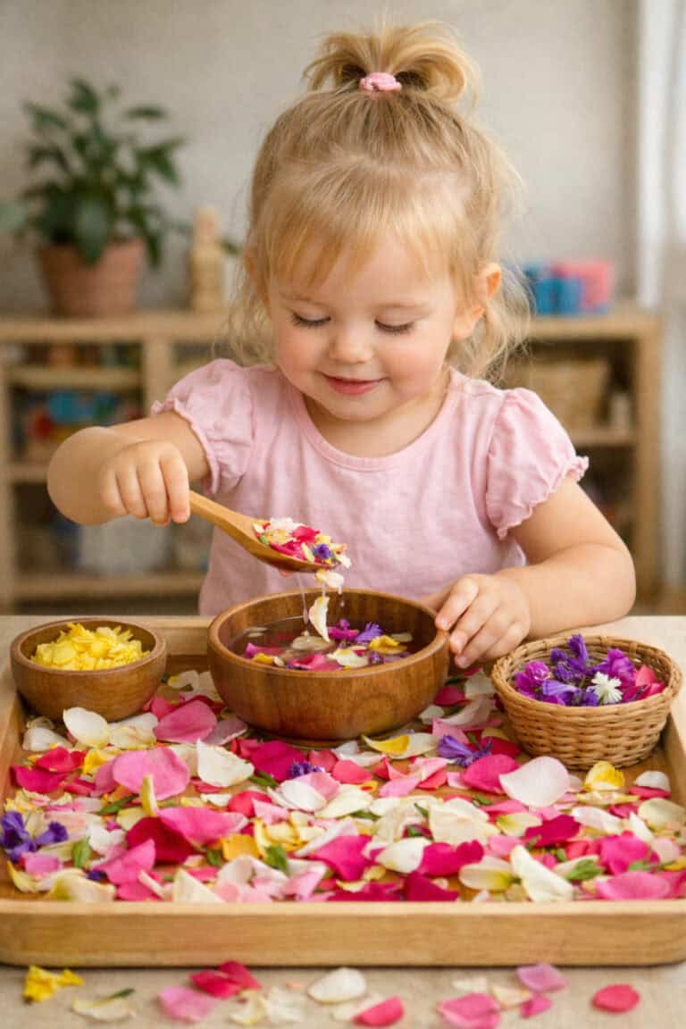 If you find fallen flowers or petals outside, bring them in. Place them in a shallow tray and let little hands touch, sprinkle, and sort. Preschoolers love making “flower soup.”