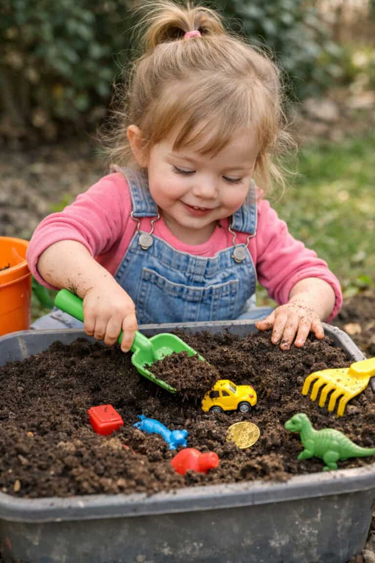 If you fill a small container with soil and hide safe toys inside, you created a treasure hunt. Preschoolers love digging.