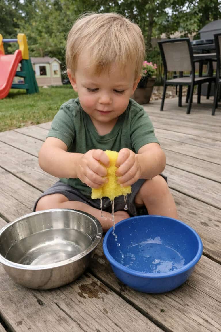 If you set out two bowls and one sponge, you have instant fine motor practice. Squeezing and transferring keeps them focused.