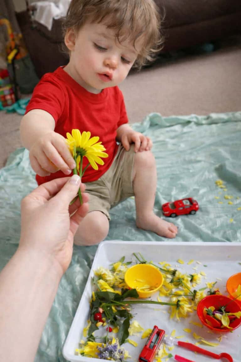 If you collect a few different colored flowers, sorting becomes the game. Even toddlers enjoy making piles.