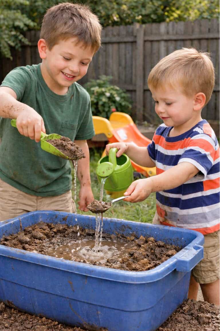Toddlers love getting messy when it feels allowed. Scoop dirt into a bin, add water, and hand over spoons. Suddenly it is a bakery or a pretend café.