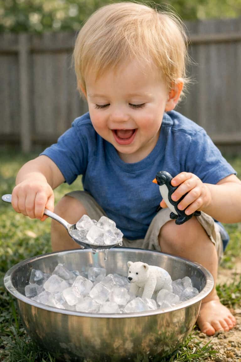 If you drop ice cubes into a bowl, you instantly have sensory play. The cold surprises them every time. Add a spoon or toy animals for scooping.
