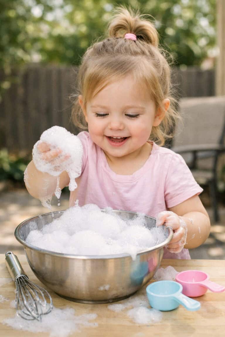 If you whisk a little dish soap and water, you get soft bubbles in seconds. Kids love scooping the foam and watching it disappear.