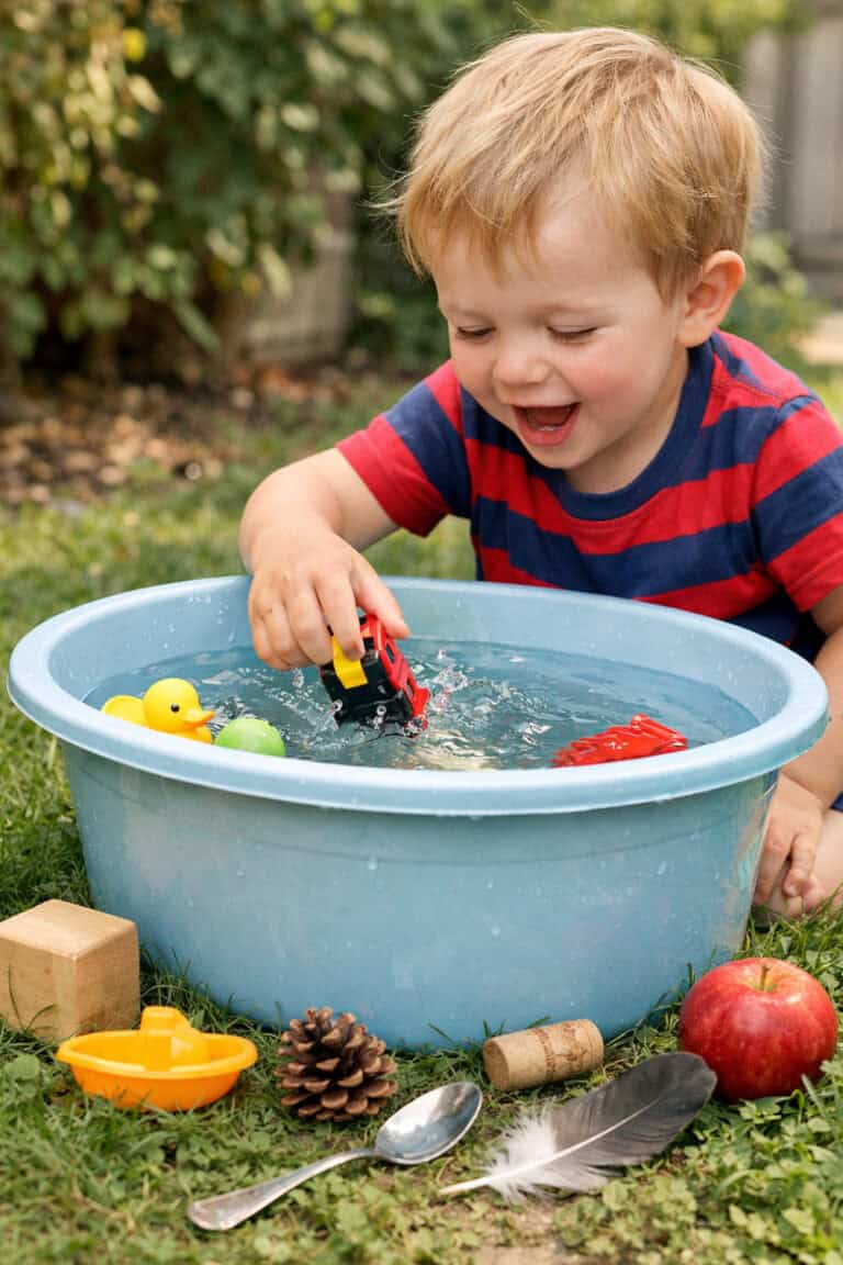 If you fill a tub with water and grab random objects, you have an easy science moment. Toddlers love the surprise of what sinks.